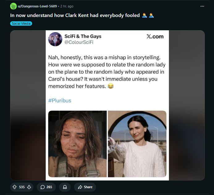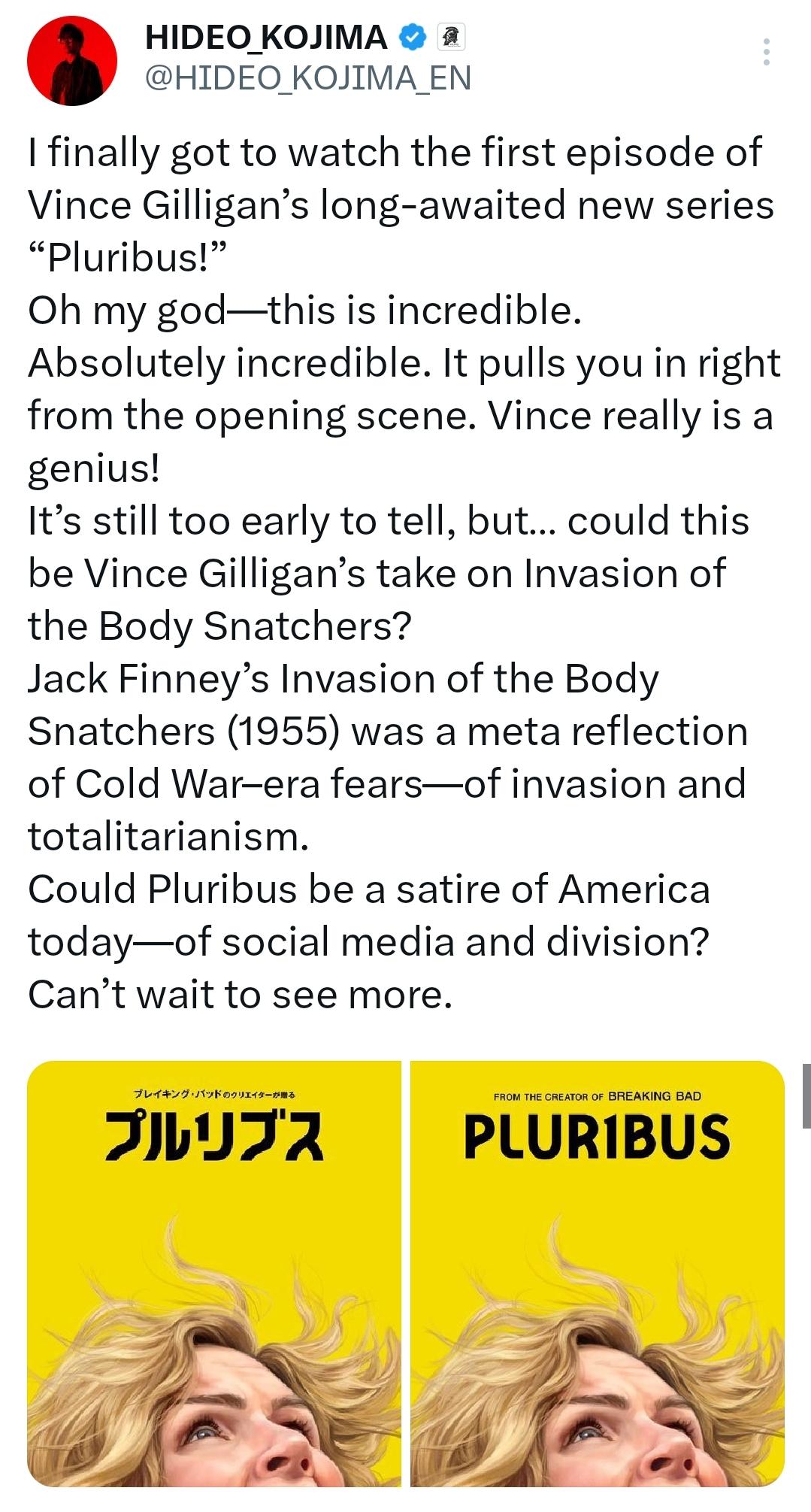 Посмотрел первые два эпизода «Лучше звоните Ким» (Pluribus). Хоть и вторичен сюжет про вторжение похитителей жоп, но мне понравилось, интригующе пока выглядит. Видно, что сделано чуваком, который раньше писал сценарии к «Секретным материалам».