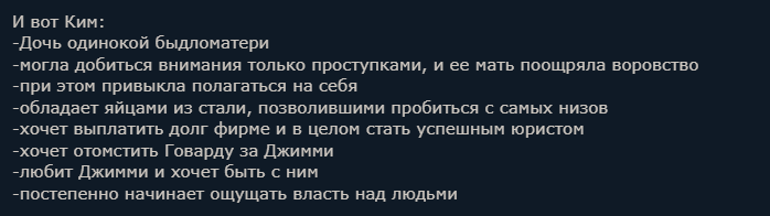 И вот Ким: -Дочь одинокой быдломатери -могла добиться внимания только проступками, и ее мать поощряла воровство -при этом привыкла полагаться на себя -обладает яйцами из стали, позволившими пробиться с самых низов -хочет выплатить долг фирме и в целом стать успешным юристом -хочет отомстить Говарду за Джимми -любит Джимми и хочет быть с ним -постепенно начинает ощущать власть над людьми
