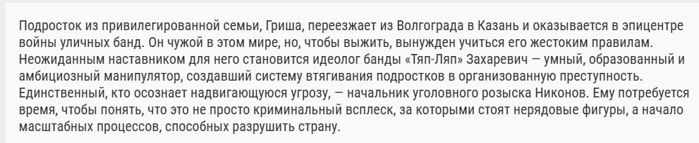 Без Янковского уже не то. А вообще, вряд ли там будет какой-нибудь "местный Адидас". Учитывая, что съемку одобрила Казань, тем более сериал с рассказа от бывшего сотрудника РУБОПа, тут максимально обставят противоположностью к Слову пацана.