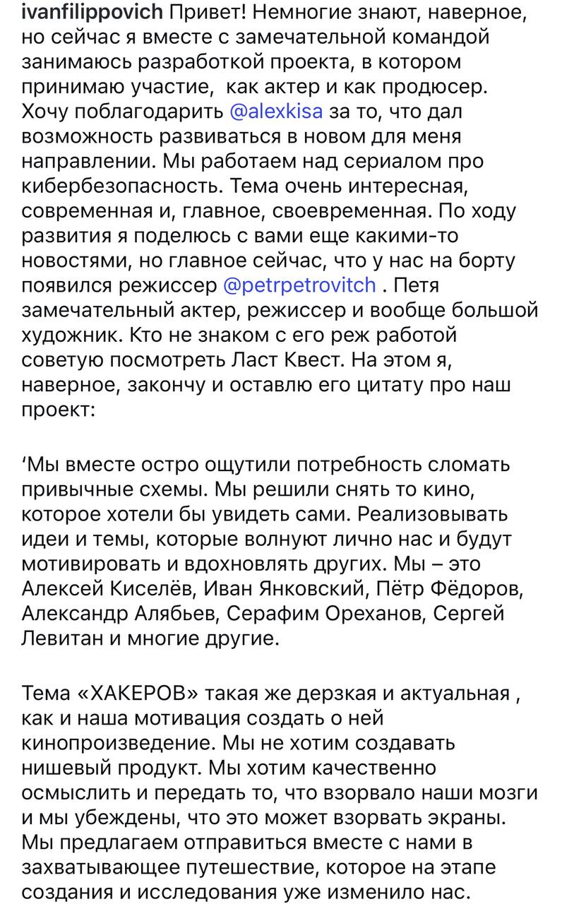 эксклюзивные подробности рассказали в Dreamcast. а чуть ранее Трифон Бебутов приоткрыл секрет, что Kisa Films - это не просто киностудия, а целое творческое объединение из соавторов и партнеров. Иван Янковский как раз входит в их число. круто? очень круто!