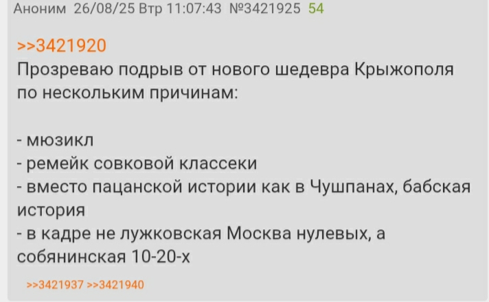 >>3432210 >-Одни и те же актеры, слишком мало актеров для такого количества сериалов, смотреть по 5 раз в год на Янковского или Кала игривого в главных ролях надоедает. Одни и те же МЕДИЙНЫЕ актёры. Кологривый, Янковский, Стоянов и пр. в каждом сериале потому что они привлекают зрителей. Можно взять любого талантливого ноунейма, но он не даст тебе просмотров. >Низкие бюджеты. Из-за этого значительное количество жанров и сюжетов недоступно. Если мы говорим про стриминг сериалы, то он изначально убыточен. Из всех вышедших сериалов за последнее время окупился только Слово Пацана. Остальной контент существует на дотациях в надежде занять долю рынка (как сейчас делает Окко). >-Нет нормальных франшизных сериалов потому что нет франшиз. Если ты про спин-оффы/приквелы, то у любого мега-успешного сериала такой появляется. Куликов к Полицейскому с Рублёвки сделал 2 спин-оффа. У 13 Клинической есть приквел из-за невозможности снимать продолжение. Но главная проблема здесь конечно, то что очень часто современные сериалы искусственно раздуваются из формата фильма. Отсюда и отсутствие продолжений дальше первого сезона и наличие приквелов/вбоквелов/спиноффов. Это кстати общая проблема, а не только у нас в России. >Из-за бюджетов ограничены жанры, почти нет фентези и фантастики Это во везде так. Годная фантастика закончилась в десятых. Посмотри на экранизации Колец, Ведьмака, Дракона, Колеса - всё низкопробное сжв-хрючево. Про космос ничего годного не снимали со времён Экспансии. Про путешествие во времени со времён Тьмы. > да и вообще почти все сериалы низкопробное говно про бытовуху Найс обобщение Во Все Тяжкие - говно про бытовуху Прослушка - говно про бытовуху Сопрано - говно про бытовуху >Скрепы, которые руинят сюжеты и делают все говном с традиционными ценностями С тобой в одной комнате? Сам термин "скрепы" - это маркер промытого долбоёба. Даже лень отвечать на такой наброс, сорян