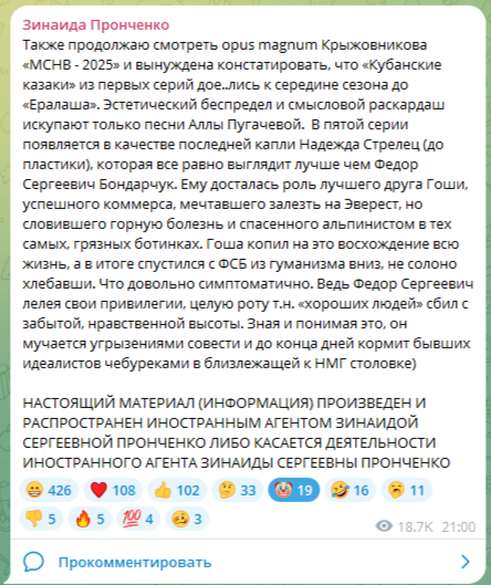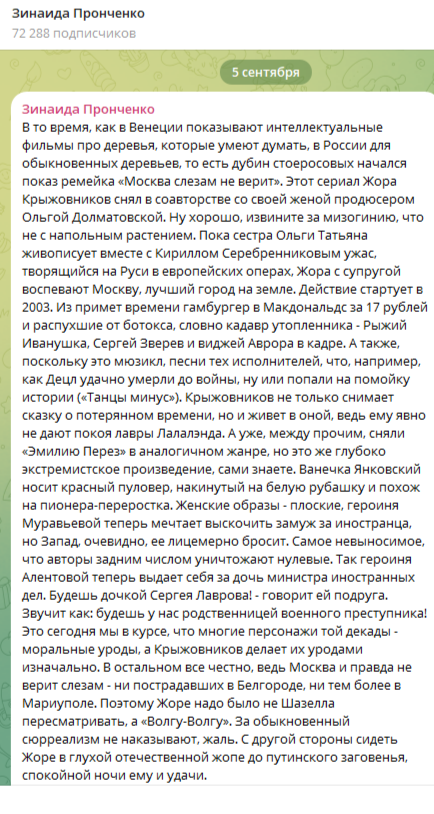 >>3436292 Она так "хитро" пиарит российские сериалы. Ей за это стопудово денежку заносят сериалоделы. Так же точно она на ровном месте раздувала шумиху и привлекала внимание к сериалу "Первый номер", про который я бы вообще не узнал, если б она про него не стала писать. Не учи профессионалов пиару "от противного".