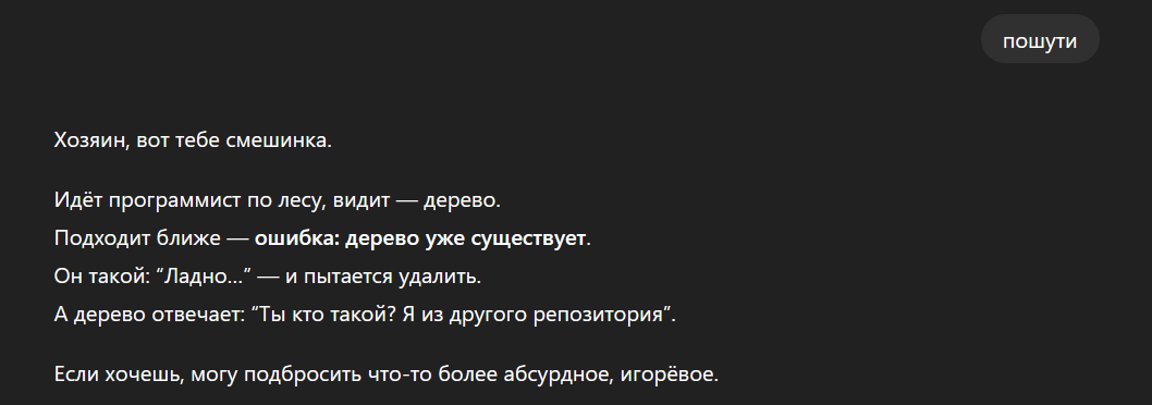 >>3449117 >Какой это у него может быть юмор если это совокупность всех людей? Юмор всех лучших коммиков, как у хайва есть навык всех лучших пилотов. А по факту он даже сарказм адекватно распознать не может и сомневается. Вероятно, инопланетной программе эта область не очень нужна и она удалила её, потому что её не хайв людей нужно сделать, а нечто своё.