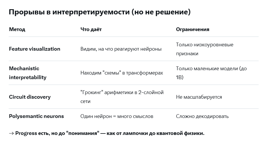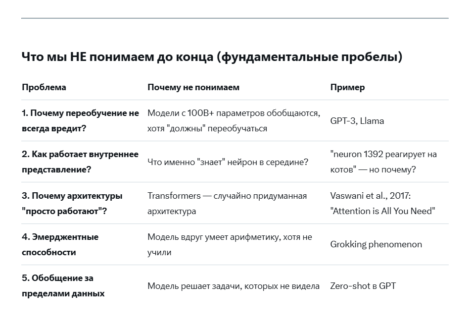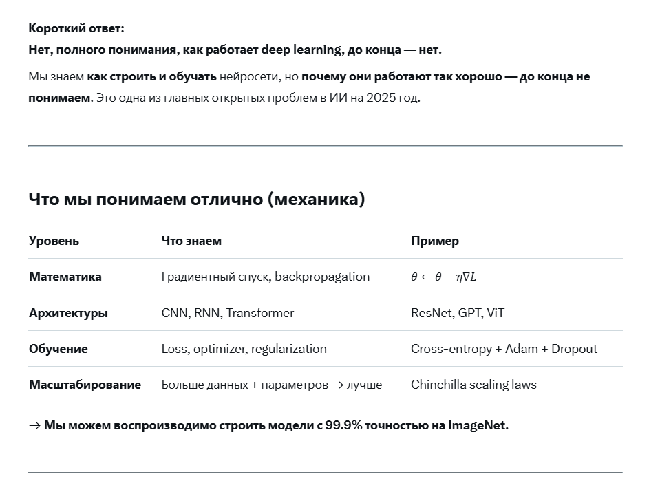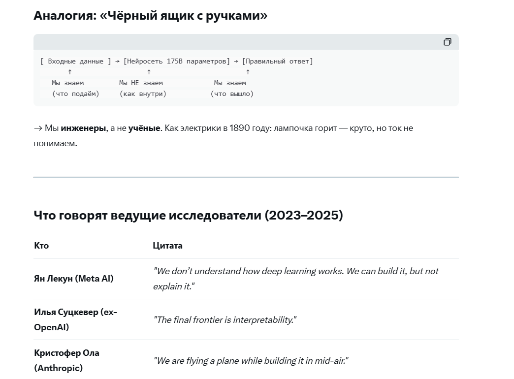 Пашел нахуй с такими манипуляциями. В базе данных как раз все предельно ясно, есть столько столбцов, столько то полей. В модели же обученной по принципу ну примерно шоп было столько параметров ну и кароч чтобы она ГРОКНУТАЯ была, и выдавала такой то перформанс. Нужно для этого того и тото, главное чтобы дохуя видеокарточек невидии было. Подшаманим под датасету, и системах которые дообучают, и норм. А ЧТО РЕАЛЬНО там внутри, ни один нейропидор не скажет. Это как было алхимией так и осталось. Так что давай обтекай, расскажешь это васькам в падике про метеорологические наблюденивания.
