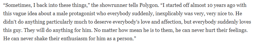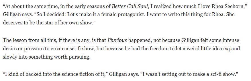 >>3447876 Согласен, персонаж какой-то нормисный у нее, типо тупо бабка, тем паче что лезбуха. Вот Волтер Вайт, Сол Гудмен был сильными и их сеттинг (криминальный мир/правовая система) интересно их раскрывал, был мощный контраст. В плурибусе мы наблюдаем за моральными терзаниями унылой ковырялки в сеттинге антиутопии, очень интересно.