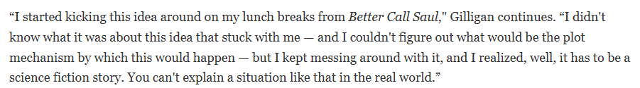 А что если гг - это Ким поехавшая кукухой после посадки Сола, взявшая псевдоним и начавшая писать книги? На почве стресса это всё окажется сном собаки, как было в "Dark", или очередным "Шоу Трумана"?