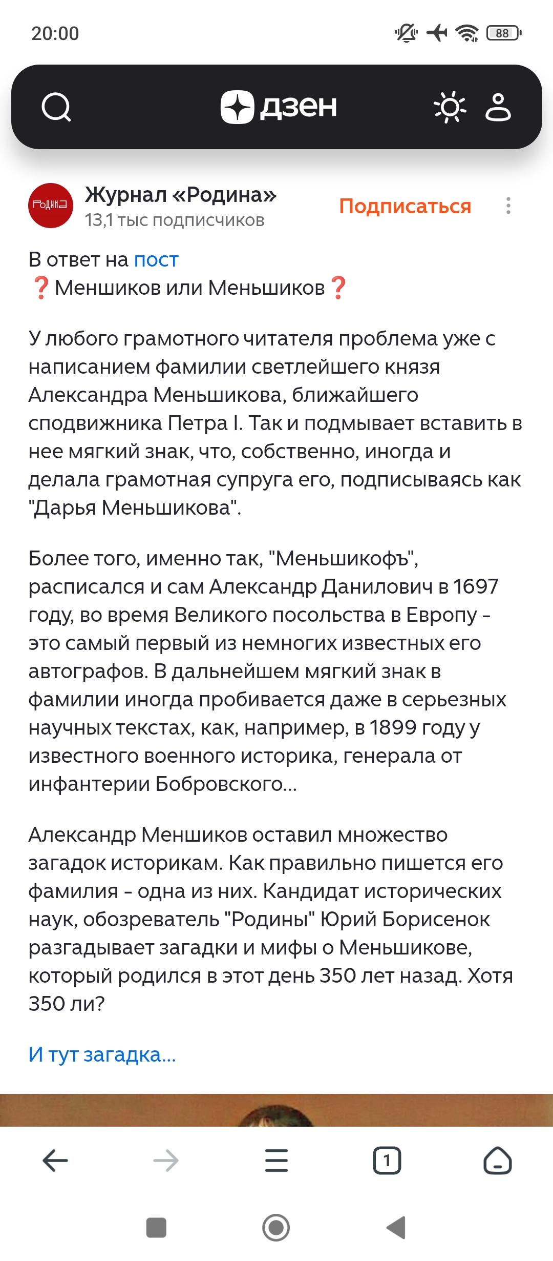 >>3449047 Вот и ответ >>3448397 → > В реале знал и Меньшикова с мягким знаком в паспорте и Менщикова без мягкого знака (заодно с чередованием "ш" и "щ"). Корень "мена", так что образование фамилии правомерно и такое и такое и сякое. Раз непроизвольно устный русский язык стремится к смягчению звука [н] в этой фамилии, значит такова многовековая тенденция. И дело не в буквенных записях фамилии. > А как писалась фамилия Александра Даниловича в 18-м веке? Он был урождён с этой фамилией или получил уже взрослым? Изменилось ли графическое написание с получением им титула князя? Появилось ли каноничное написание на латинице для иностранного посвящения и титулования? А то он титул получал и в Священной Римской империи, где кириллица не в ходу.