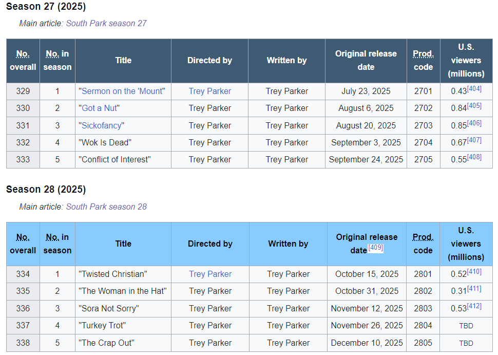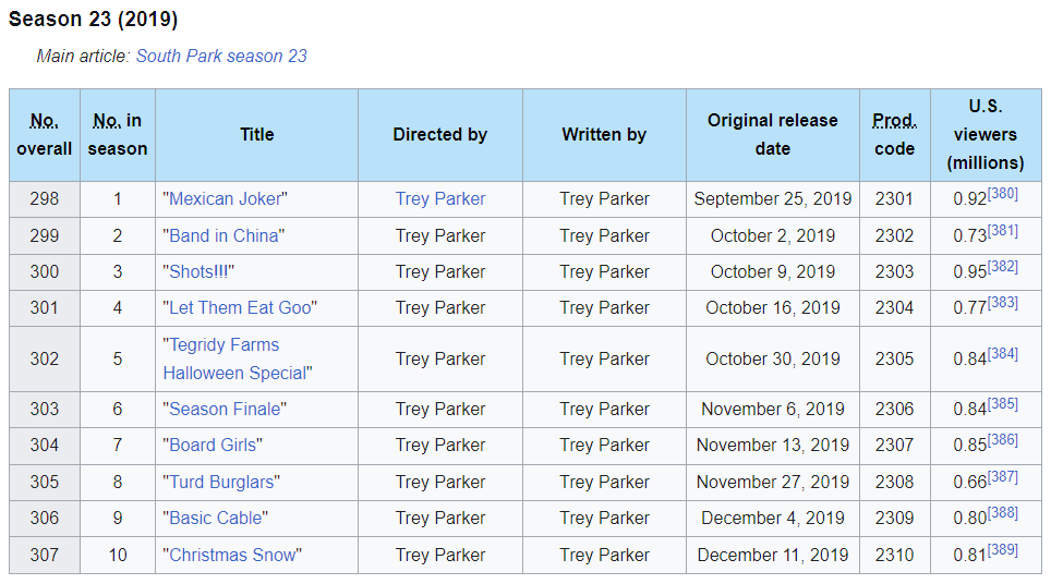 В колонке "U.S. viewers (millions)" на вики обычно указывается число линейных просмотров на телевидении (щас это Comedy Central) в день премьеры. а щас уже лет 10 как рейтинг подсчитывается по кросс-платформенным показателям. там несколько иные правила подсчёта.