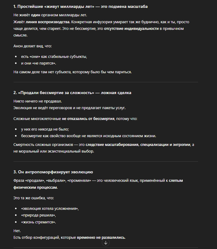 >>3464610 Тыскозал? Это не вирус гриппа, у которого нет смысла жизни, потому что он слишком тупой понять что он делает. Он просто так делает. А почему? Ну хуй знает. Естественный отбор так подфартил. Тут диалог с неким разумным существом, которого эта компашка должна волновать не больше чем обосравшийся заяц в соседнем лесу. Но почему-то он за ними бегает. Что полная хуита уровня императива непротивления.