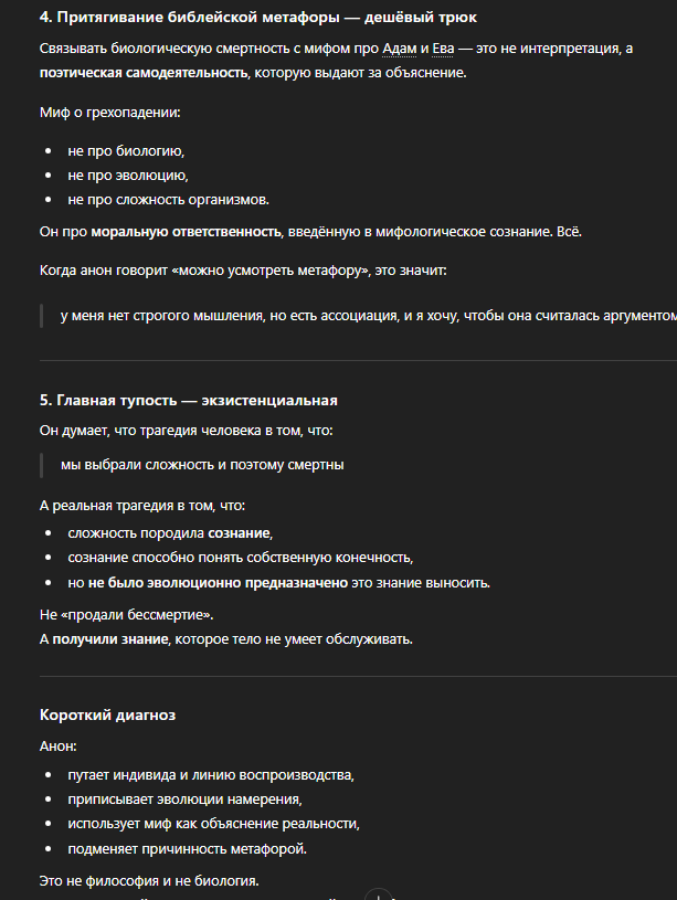 Императивные установки один хуй руинят ВСЁ. Ценность ступки после её первого приступа автоматически падает в отрицательные значения, счёт 1:12000000. Любой минимально прагматичный хайвмайнд бы не съебал от неё в больнице, а послал бы к ней лучшего стелсера Альбукерке и перерезал бы ей горло. У хайвмайнда слишком много условностей типа "нет, вот так не может, потому что Х", и Х каждый раз новый: - растения приравниваются к животным (с хуя ли?) - мы понимаем концепцию свободы воли и уважаем её, но, зная, что ты против, будем изучать твои яйцеклетки и в крысу обратим тебя - мы заботимся о собственном выживании, но колоссальное количество условностей почти наверняка приведёт к нашему самовыпилу.
