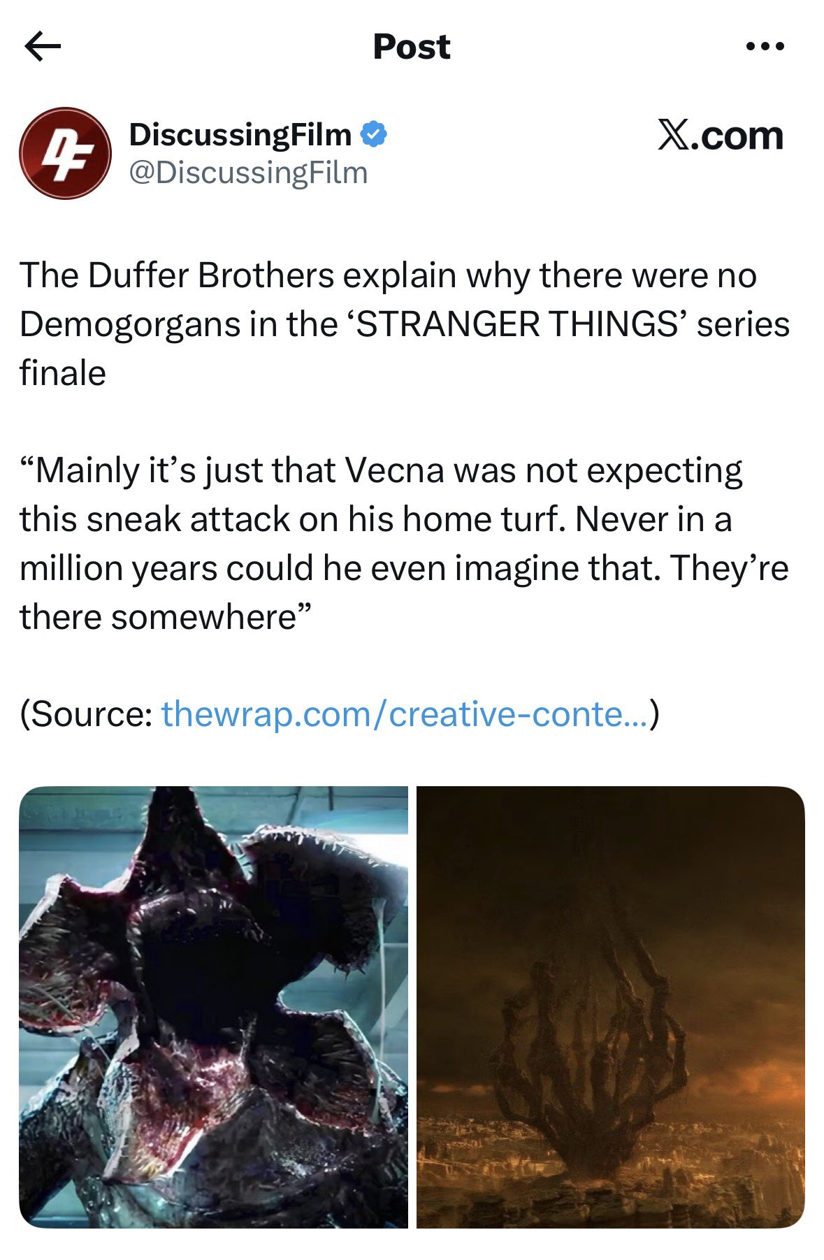 Просто удивительный обсёр последних трех серий по сравнению с остальным настолько феноменален и нелогичен, что люди пытаются найти хоть какое-то объяснения этому, с этого и массовый психоз у всей прослойки - я видел и бугурты мужиков с тиктоками и твиттерами. Шиза с доп эпизодом идёт туда же. Но обсёр и массовая истерия во многом заслужена, ибо сюжетных дыр настолько дохуя что Дафферам приходится отвечать на самые простые вопросы в интервью, которые при этом звучат в духе "ну мы не знаем" "мы не подумали" "интерпретируйте как хотите" "на ваше усмотрение" "это произошло за кадром" при том что до начала сезона они галдели про то что ВСЁ ВСЁ объяснят и не будет никакой неопределенности. И на это всё, напомню, ушло полмиллиарда долларов. Долбоебы короче, надеюсь их с говном смешают так же как и директоров игры престолов