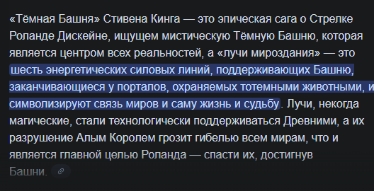Уже в прямую говорится, что должно произойти. Впрямую говорится, что зритель должен чувствовать. И пошли отсылки на тёмную башню. Двери в ничто, дети, которые будут пилить нити мироздания. лучи мироздания Как раз 6х2 (от башни к тотемным животным) 12 будет. Хотя если попытаться притянуть за уши, что генри - флегг, что он колдун, а значок рака на одежде холли максин - отсылка ко второй книге, где гг отгрызли пальцы, может реально попытались вдохновиться тёмной башней.