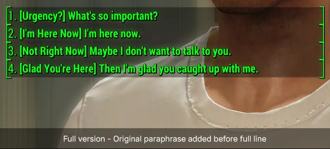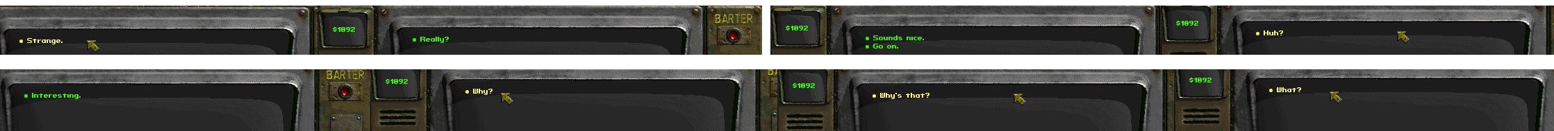 >>3471191 >>3471206 Увидел вчера эту картинку второй раз в обсуждениях на другом форуме, и решил проверить, что там за "ужасный" диалог В общем. Подходишь к торговцу оружием и спрашиваешь, есть ли у него на продажу что-то особенное. Он спрашивает, работаешь ли ты на казино. Для убедительного ответа нужно 30 убеждения. Ответ всегда один - "нет", но результат разный. Если чел посчитает, что тебе можно доверять, то предложит на продажу дополнительные пушки. Если убеждения не хватит, то он предложит свой обычный ассортимент Навык спича тут просто определяет, как надежно выглядит ГГ, а не то, что типа "ыыы а чо для отвата из трех букв нужно навык качать ыыы"