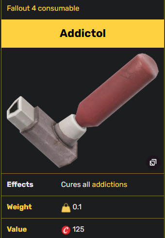 Интересно отметить, что цена на аддиктол (125 крышек) точно такая же, как в Fallout 4, тогда как в Fallout 76 он стоит 60 крышек. Очевидно, инфляция — это реальная проблема во вселенной Fallout, но странно, что цены настолько одинаковы в регионе Мохаве и в Содружестве на другом конце страны.