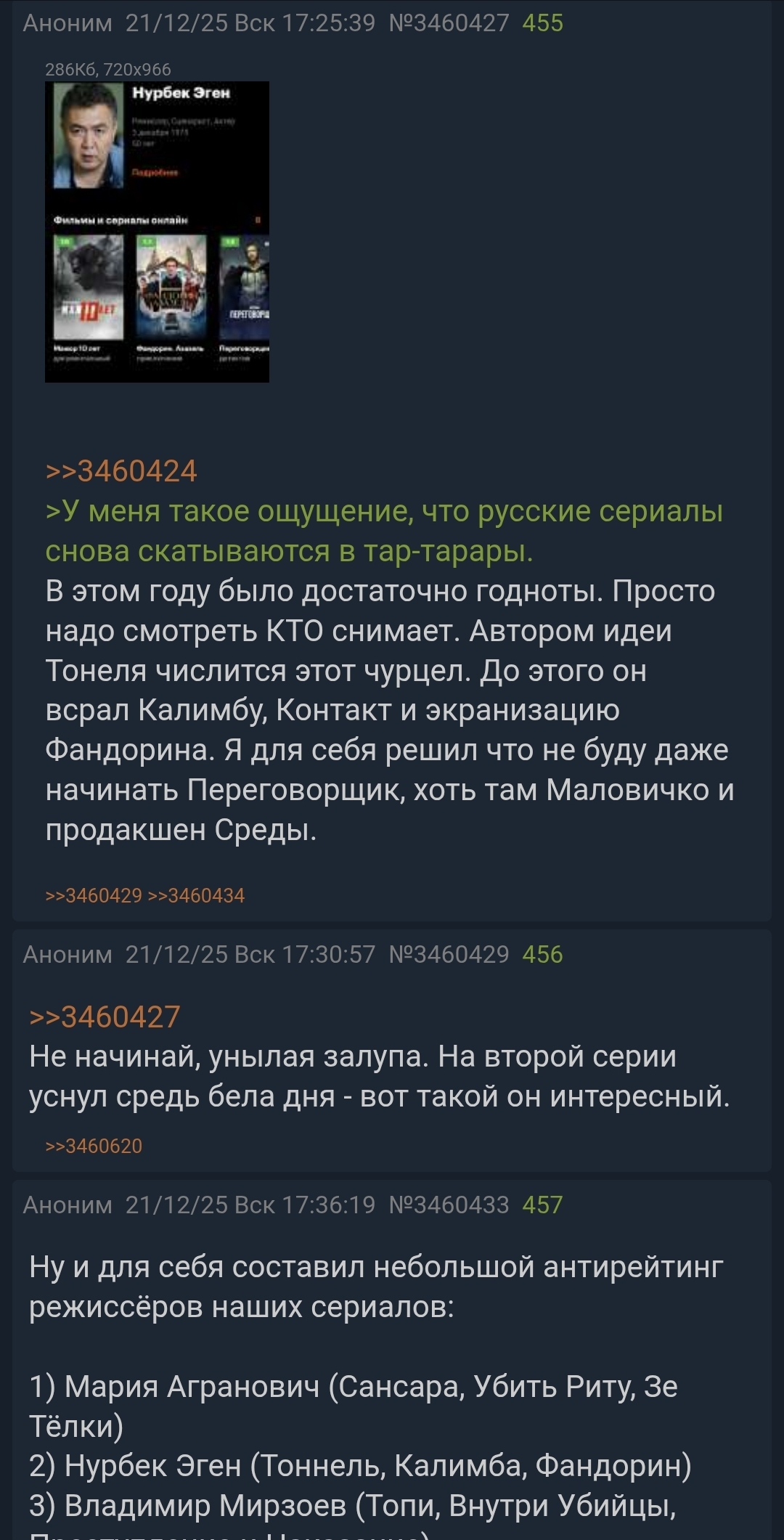 >>3473446 Поддерживаю про Нурбека. Я, хз, как но у него всегда получается говно. При этом судя по картинке в его сериал он работает всегда на самых дорогих продакшенах регион.