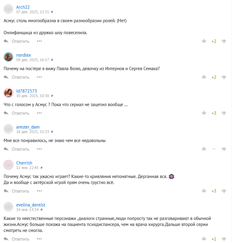 Пока лично для меня больше всего вытягивает Фёдоров - сымый целостный персонаж, Гг пока слишком картикатурная, а остальные слишком посредственно играют, особенно актёры второго плана.