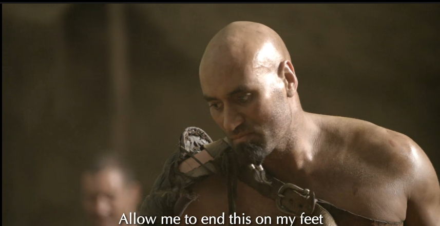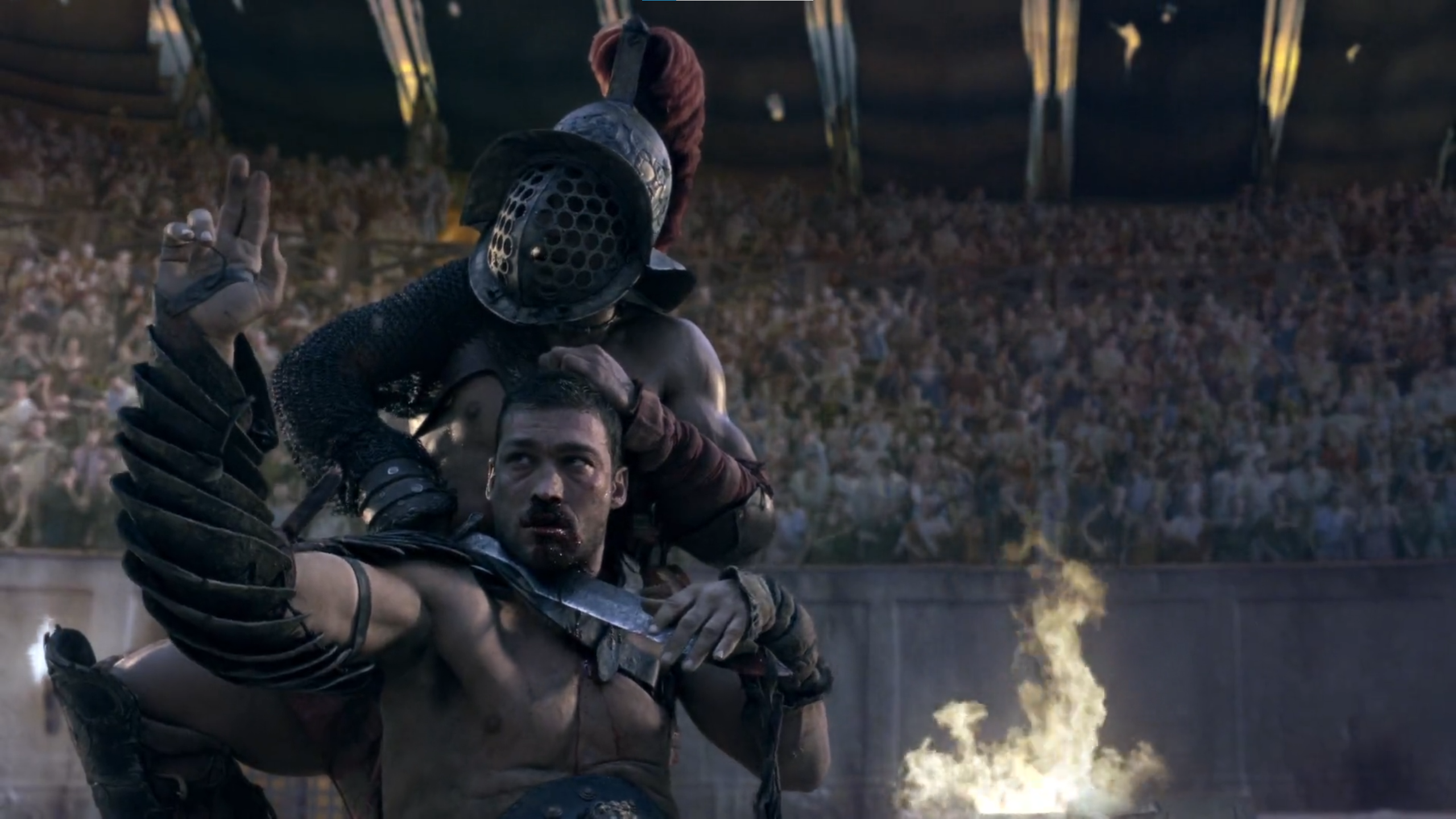 Как-то совсем проебали всю гладиаторскую шнягу. У Спартака, кусок сюжета посвященный их гладиаторской движухе. В частности вот этому знаку "Сдаюсь"