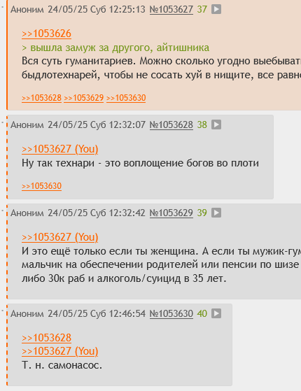 >>1054097 Гуманитарное образование – это не про "пойти потом на работу", это скорее развлечение для тех, кто хочет углубиться в смыслы, людей, языки, культуру, то есть продлить детство. Гуманитарка — это хобби с дипломом. Не каждый хоббит хочет быть офисным орком. А ты, Продыроколенный, потратил 4 года на изучение псевдонауки ради РАБоты, где даже высшее образование по сути не требуется.