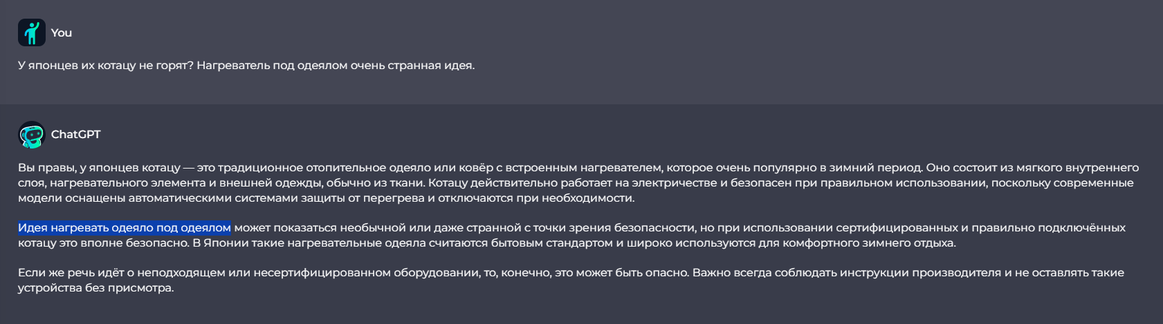 Такое ощущение, что ты нейронке мои ответы просто скармливаешь, а потом постишь их сюда. Такую тупую хуйню человек сделать просто не способен.