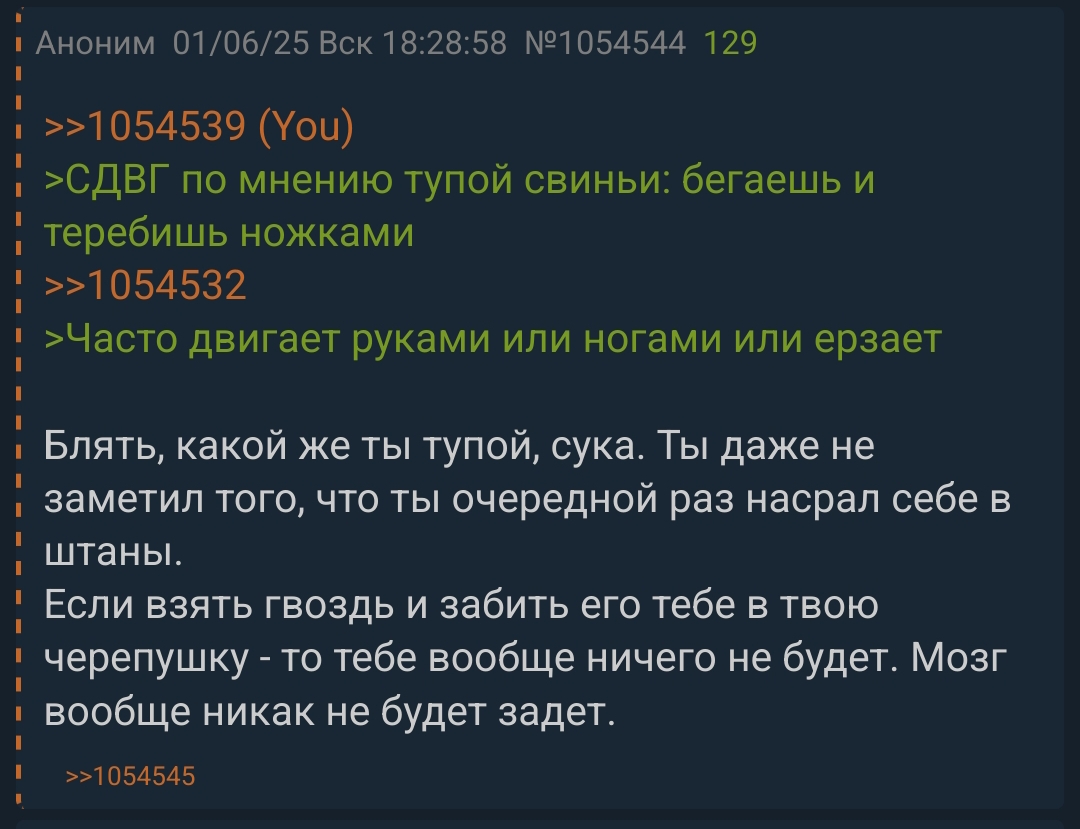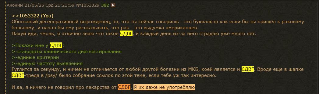 >>1054509 В предыдущих тредах я обоссывал шиза, отрицающего существование СДВГ. Щас это делает кто-то другой, если что. Хотя вроде как и шиз тут не один, но мне даже читать это лень. Меня это искренне заебало, ибо смысла это никакого не имеет: этот ебанутый никаких своих аргументов не приводит, а на чужие аргументы не отвечает, споря с соломенным чучелом какого-то наукобота в своей голове. Абсолютно тупейший спор с тупейшим человеком с синдромом Даннинга-Крюгера. Но другому анону желаю удачи