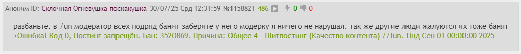 А агроному и тд, излишнее напоминание: с каждым обходом бана срок основного будет увеличиваться в геометрической прогрессии. Обсуждение модерации в данном разделе, в данном конкретном треде, вне /d - также будет караться соответствующим образом.