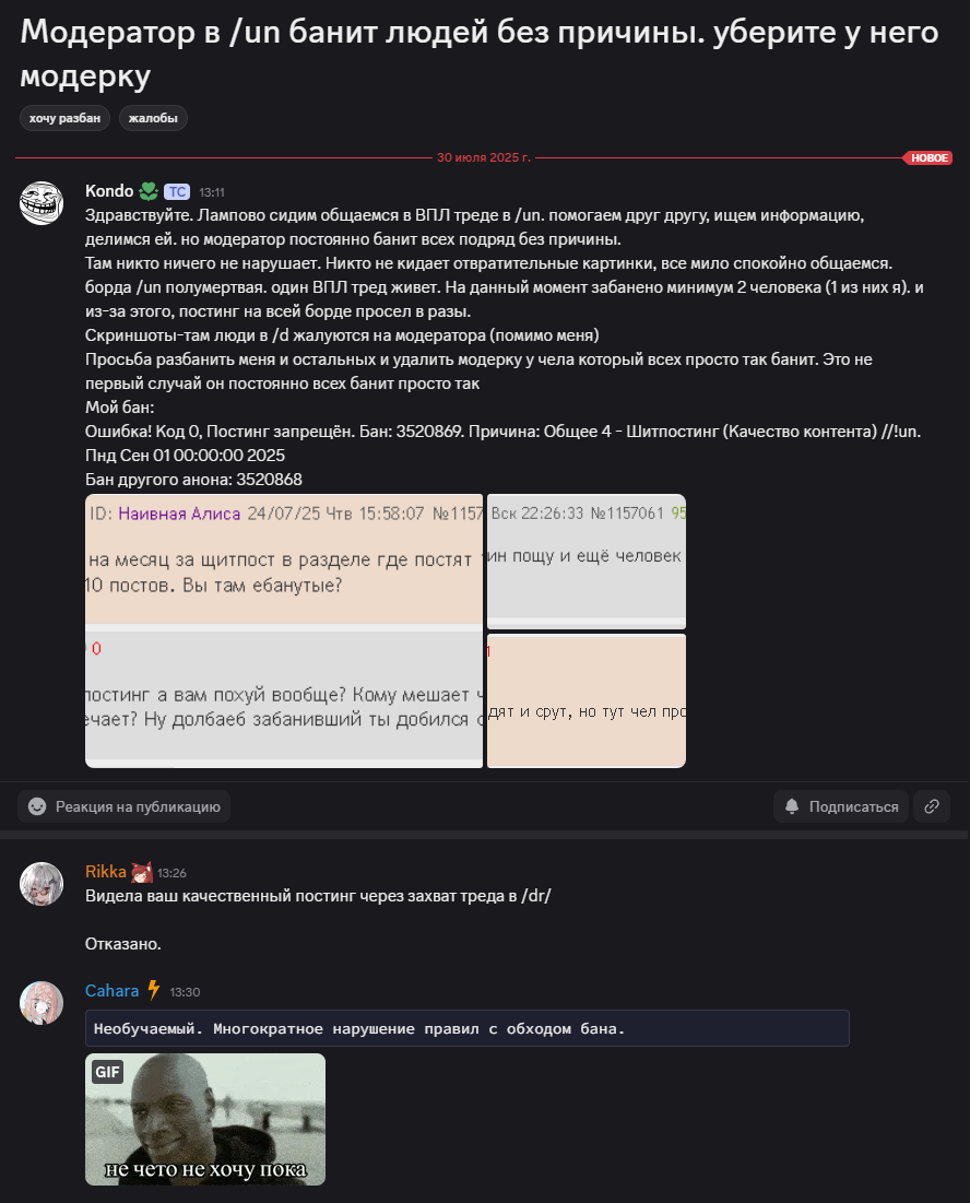 >>1063067 >бан за щитпостинг на имиджборде То есть модератор просто решает, что ему нравится, а что не нравится. Никаких объективных критереев. Какому-то хую не понравился пост, он его классифицирует как щитпостинг и выписывает бан. Теперь меня вообще не удивляет, что тут годами трутся совершенно рандомные посты, а общение глушится до той степени, что доска почти сдохла уже. Зато нет постов, которые эстетически неприятны модеру