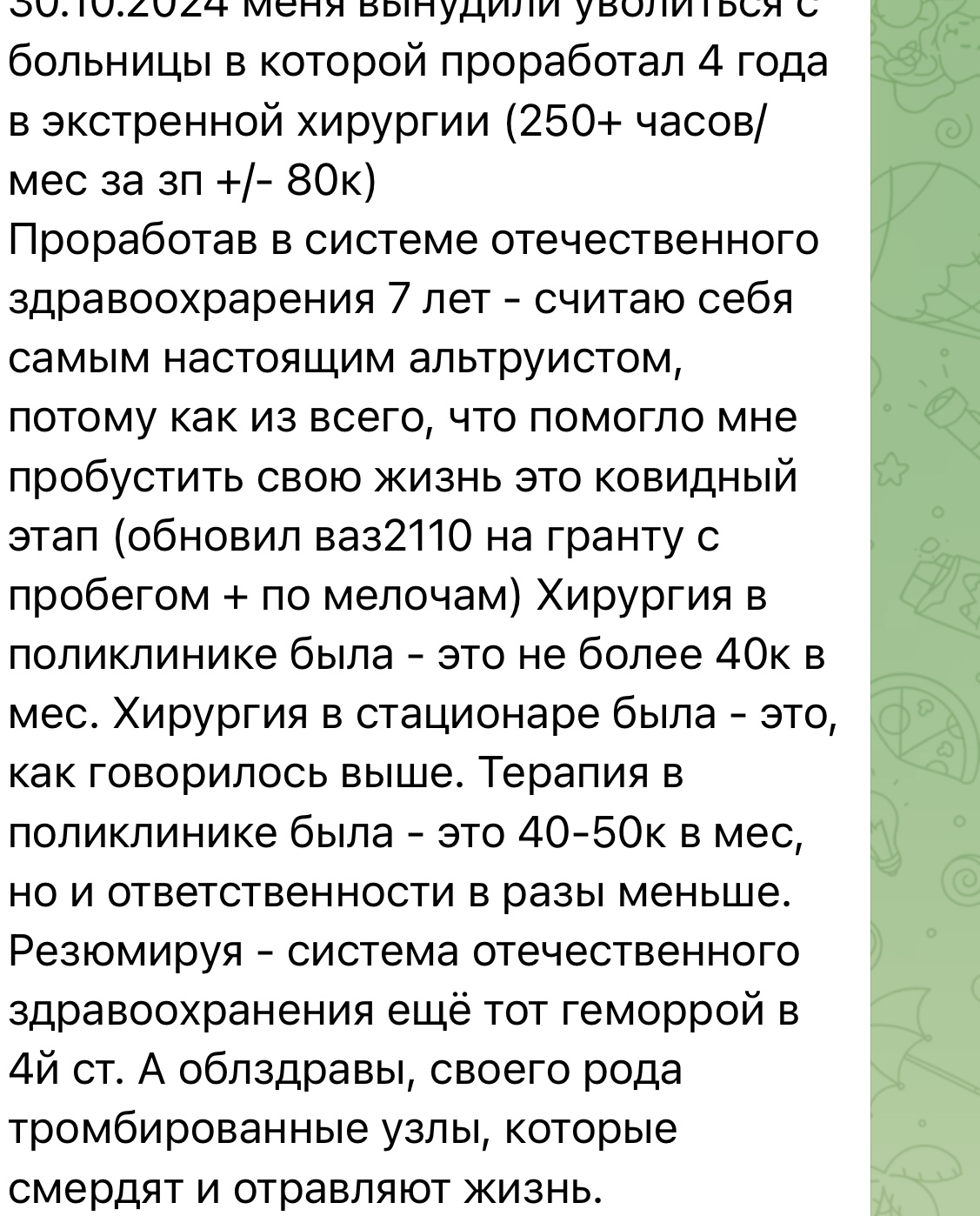 С одного качественного пациента, за неделю лечения, можно взять сумму большую твоей месячной полковской зарплатки. Понятно, что придется делиться с завом а ему с начмедом и выше по лестнице, но все-равно получается очень жирно.