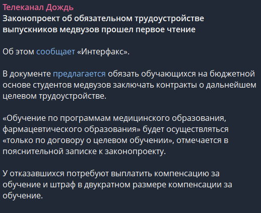 Госдума приняла в первом чтении закон о запрете врачам пользоваться правом на бесплатное образование без целевых договоров — депутаты одобрили также введение принудительных отработок Госдумой одобрена принудительная отработка и для врачей, обучившихся на платном отделении ТЕРПИМ КАРЛИКИ
