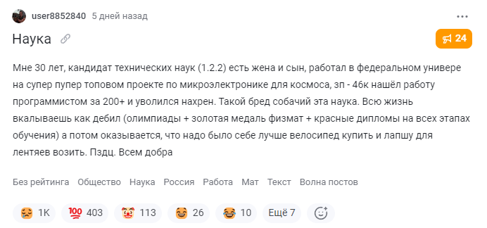 В 33 поступил в Аспирантуру чтобы вкатится в академию и живу в общаге, как полугрек полурусский диаспоройд. Но после прочтения этого треда мне сразу стало лучше.