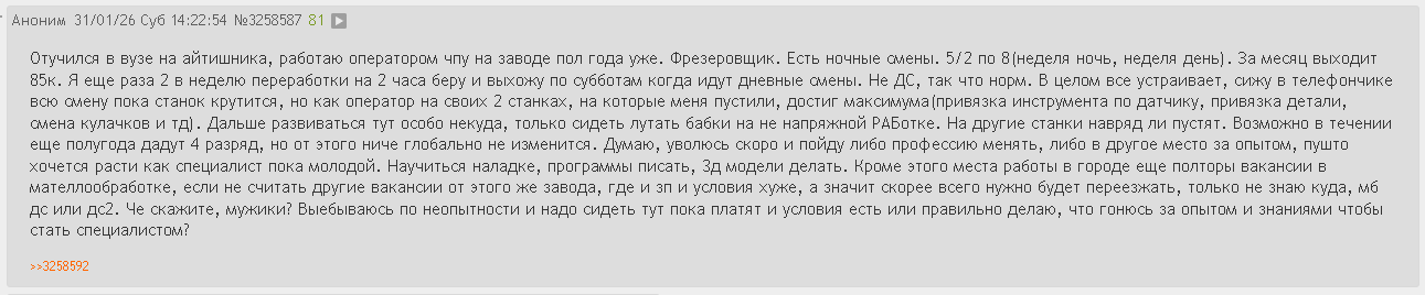 >>1080299 На пикриле айтишник пошел на завод и жалуется что там потолок 85к. Ночные смены убивают здоровье. По 8 часов на заводе никто не работает в ДСах, только старики токаря которые вручную пилят детали. Даже 10 лет назад уже график у всех был по 12 часов 3 через 3. С 8 утра до 9 вечера работаешь, в 9 идешь домой счастливый на метро добираться.