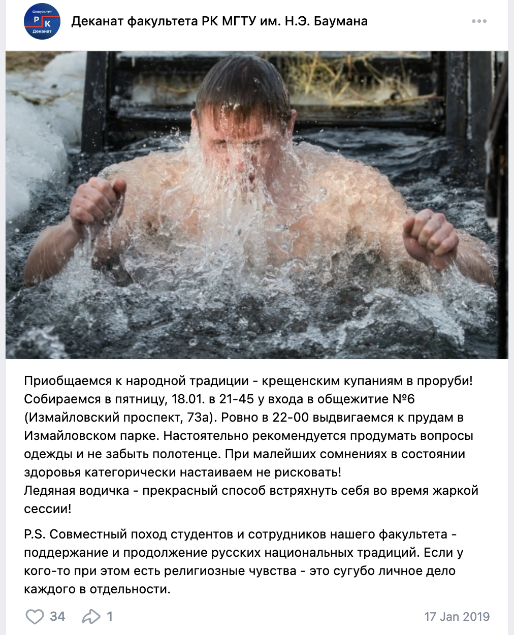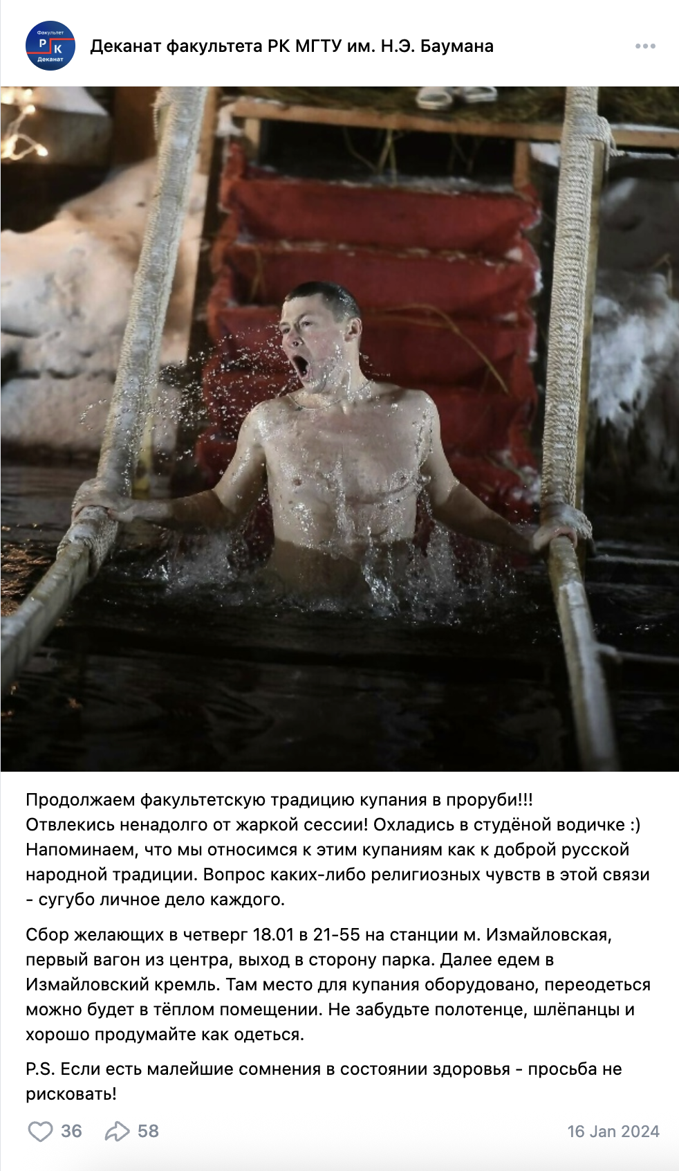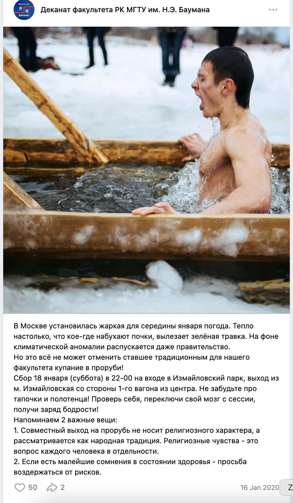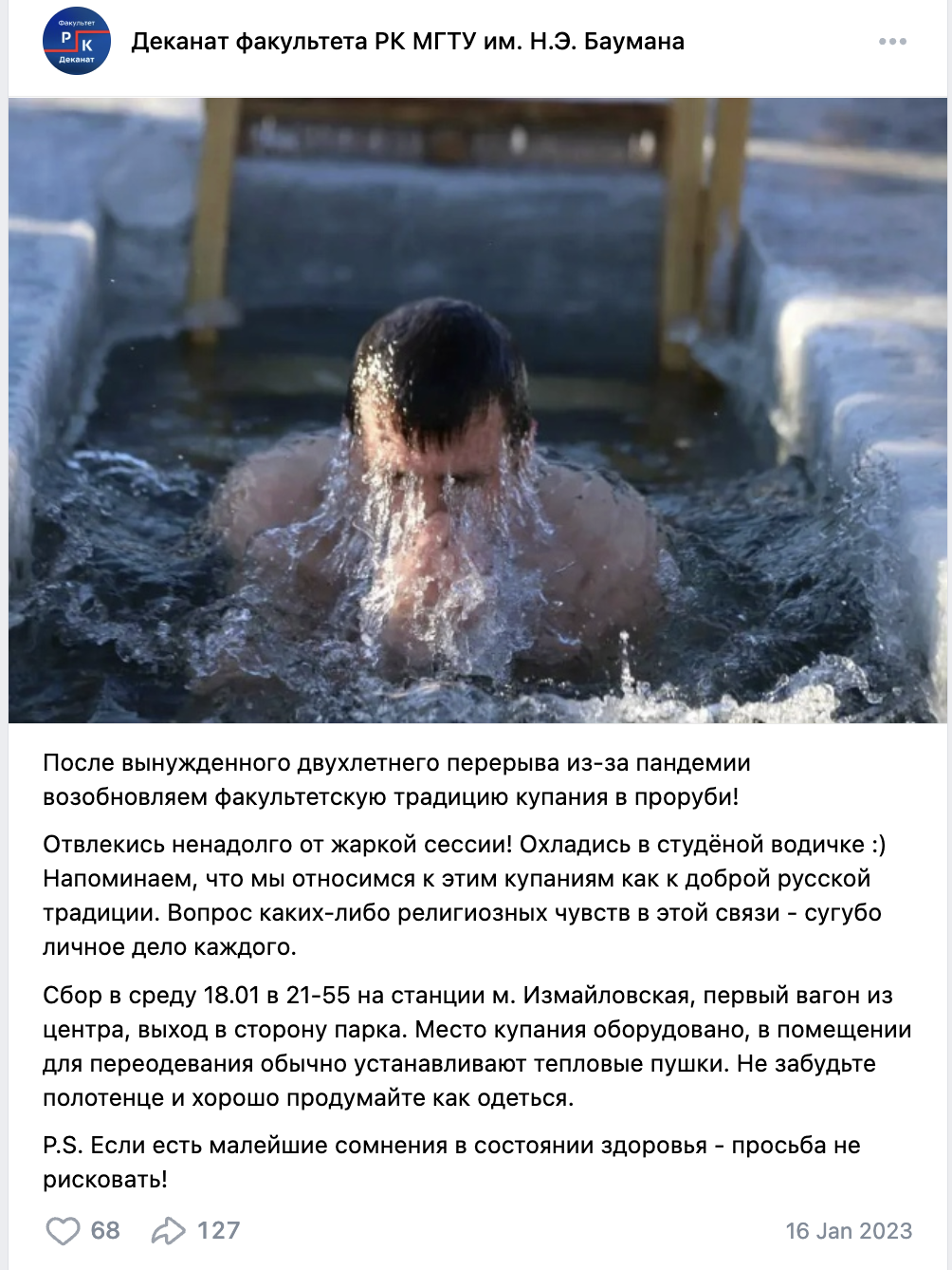 >>1079737 1) Я не Вадим. 2) Я просто поинтересовался, существует ли до сих пор старая традиция моего факультета ходить купаться в проруби с замдеком? Лично я не вижу в этом ничего плохого. Раньше посты в группе вк были, буквально 2 года назад, сейчас их уже нет.