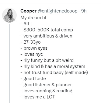 >>101725 Черри-пикинг. Разные женщины за разные типы отношений и у них разные взгляды на то, каким должен быть их мужчина, как и у мужчин могут быть разные взгляды на этот счёт, каждый дрочит как хочет. Должны ли это быть классические отношения, где женщина хранит очаг, а мужчина типа добытчик ресурсов и защитник (что в современности чаще всего неактуально ни для мужчины, ни для женщины) или это должны быть партнёрские отношения или вообще какие-нибудь свободные отношения или дружба с привилегиями, да дохуя вариантов. Если женщине надо, чтобы её обеспечивали, окей, пусть ищет себе такого мужчину, а если ты не хочешь её обеспечивать, то отсекайся от ней всё, так же как и ты спокойно можешь отсекать тех, кому твой желаемый формат отношений не подходит, в чём проблема-то?