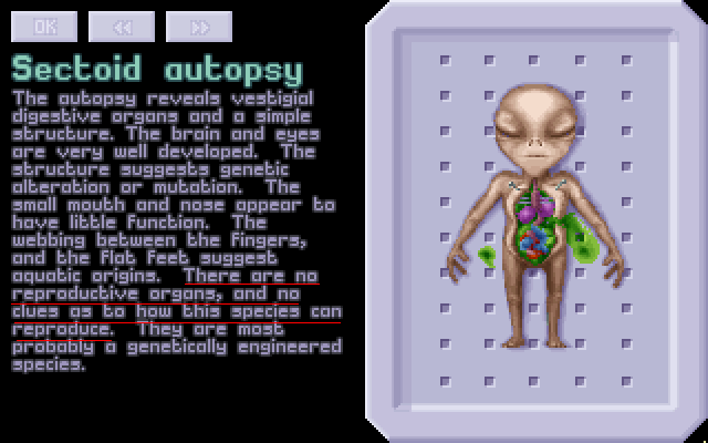 >>101545 (OP) На пике - отчет вскрытия сектоида, инопланетянина из стратегической игры UFO для DOS. В общем, у серых гуманоидов половая система полностью отсутствует, они размножаются клонированием.