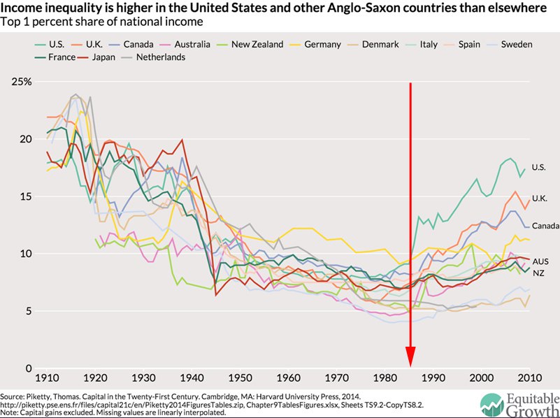 >>50847 Вообще да, ты прав. Но есть явная тенденция к возрастанию неравенства после крушения социализма в мире и упадка левых идей, наступления реакции. А после 1945 левые идеи как раз стали очень популярными, и "коммунистическая угроза" вновь всерьез напугала руководство западных стран. Так что определенная связь тут есть. Ну опять же, это не единственный фактор, борьба рабочих, профсоюзов тоже сыграла немалую роль.