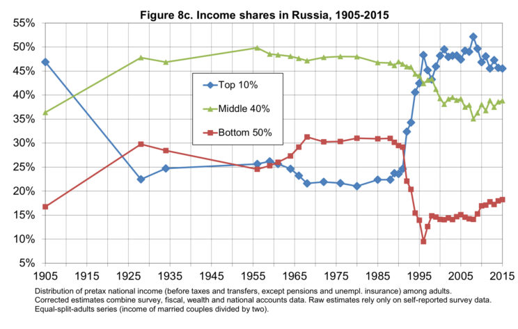 >>50846 >То есть, самый-самый топ миллионеров и миллиардеров в самой капиталистической стране мира был всего в 9 раз богаче среднестатистического американца? Нет, и я немного не понимаю, как ты это высчитал. Неправильно ориентироваться на средний доход, вычитая лишь 1 % населения. Про США на руках статистики нет, но возьмем пример России, где в 2015 по подсчетам того же Пикетти 10% населения владело 45% дохода, из них 1% владело 20% дохода. То есть, на долю среднестатистического россиянина, если вычесть 10%, приходится очень мало. На средние 40% и приходится где-то 40%, а на беднейшие 50% приходится 18%. ти