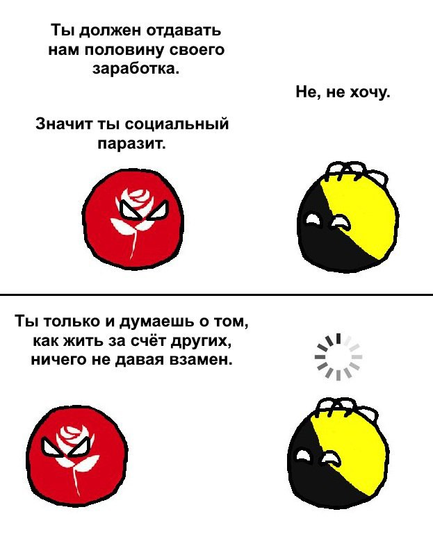 >implying that he understand the idea of communism Но ведь он прав - коммунизм строиться исключительно на том, что пролетарии, суть, невинные жертвы, которых постоянно тиранят буржуи. То, что пролетарии допустили буржуев во власть и не могут без тунеядцев организовать производство, конечно, никого не волнует.