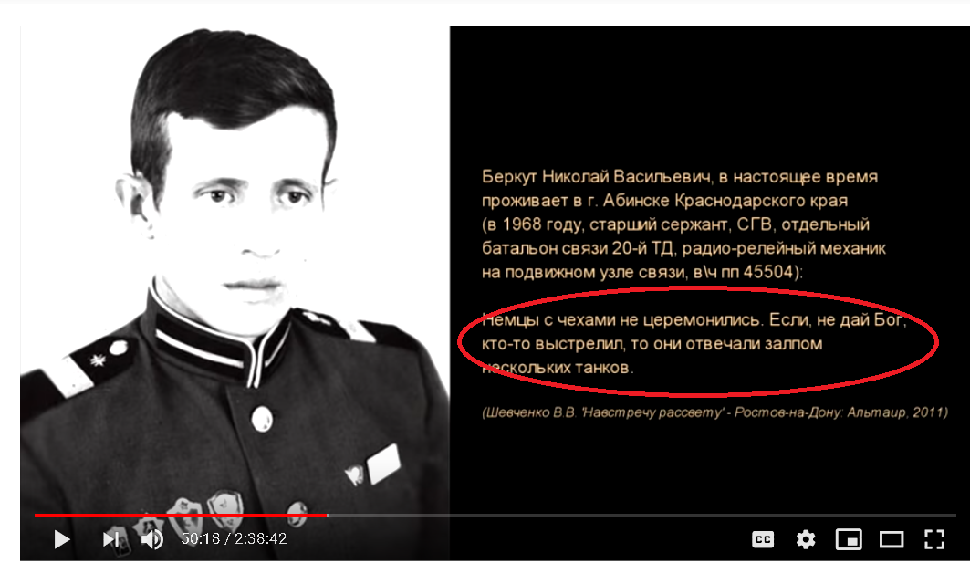48:50 >Советское руководство не решилось на ввод регулярных войск ГДР >ГДР послало только военных наблюдателей 2 минуты после этогоб 50:10 : >немцы с чехами не церемонились и на выстрелы отвечали залпами нескольких танков 50:20 >чехи возвели баррикады, немцы не растерялись и просто переехали их танками