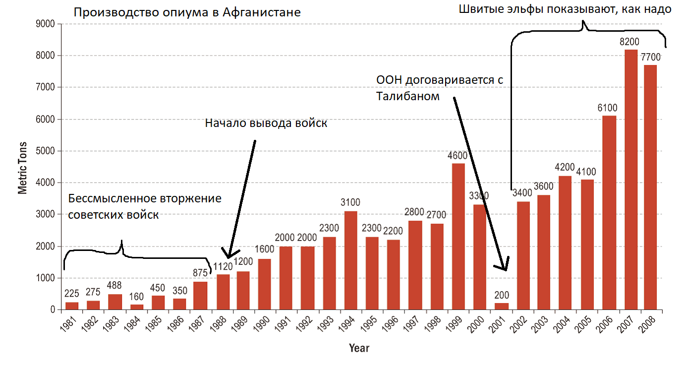 Т.е. советские войска там поддерживали порядок. Войска вышли, порядок поддерживать стало некому и страна превратилась в мирового лидера по производству наркоты. Причем, как ты можешь заметить, у амеров уже такой задачи не было, производство наркоты при них вообще в небеса улетело.