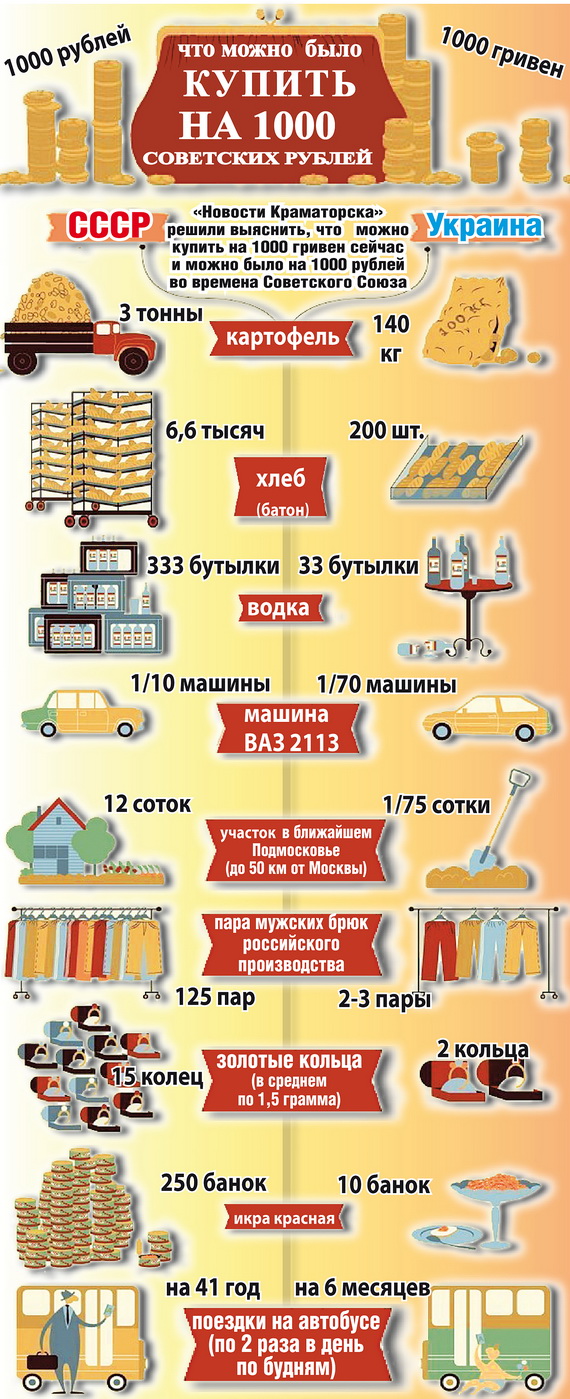 ладно объясню: 1000 рублей в СССР хватало на все каждый-дневные нужды и больше. Шяс за 1000 рублей или гривен шиш получишь. Рубль стоил доллар и 15 центов (при 'застое' Брежнево) а шяс надо 62 рубля на Доллар. О Гривен и говорить не надо. Это было б и так ужасно но что хуже, ЦЕНЫ подняли... и получается что в СССР простой пролетарий получал Лучше чем при Капитализме.