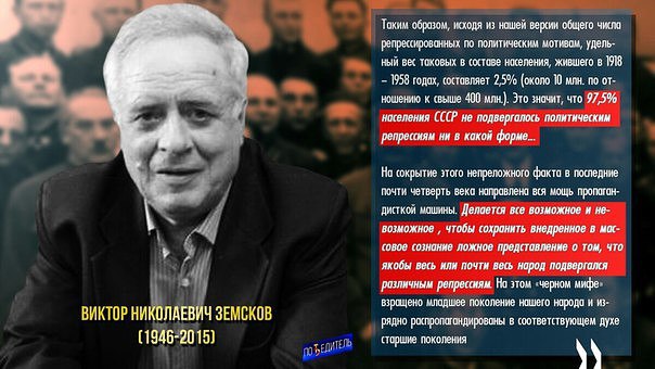Ну и надо понимать, что Земсков занижал цифры погибших от 58 статьи: - он не учитывал расстрелянных непосредственно в лагерях (за саботаж, за невыход на работу, за попытку побега, убитых в лагере блатными и т.д.), а это ведь тоже фактически жертвы. - он не плюсовал туда умерших под следствием (от пыток на допросе (разрешенных), покончивших жизнь самоубийством, от ухудшения здоровья и так далее). - он не подсчитывал количество заключенных по 58 статье, расстрелянных при отступлении РККА в 41-42 году на европейской части СССР.