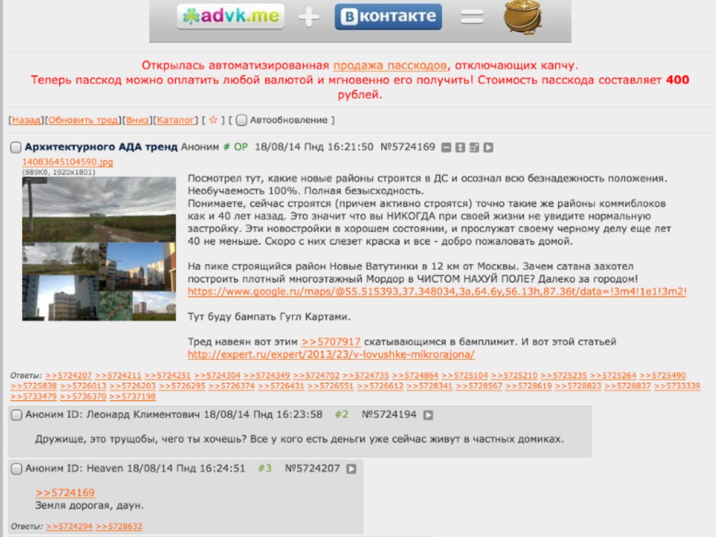 >>27685 Что-то заглохли коммиблок-треды. А тем временем ни государство, ни население не осознают наличия глобальной проблемы (хотя в Москве какие-то сдвиги есть). Даже наоборот - все всем довольны и выставляют введенные миллионы квадратных коммиблокометров как достижение. Вроде хотели создать петицию или что-то вроде того.