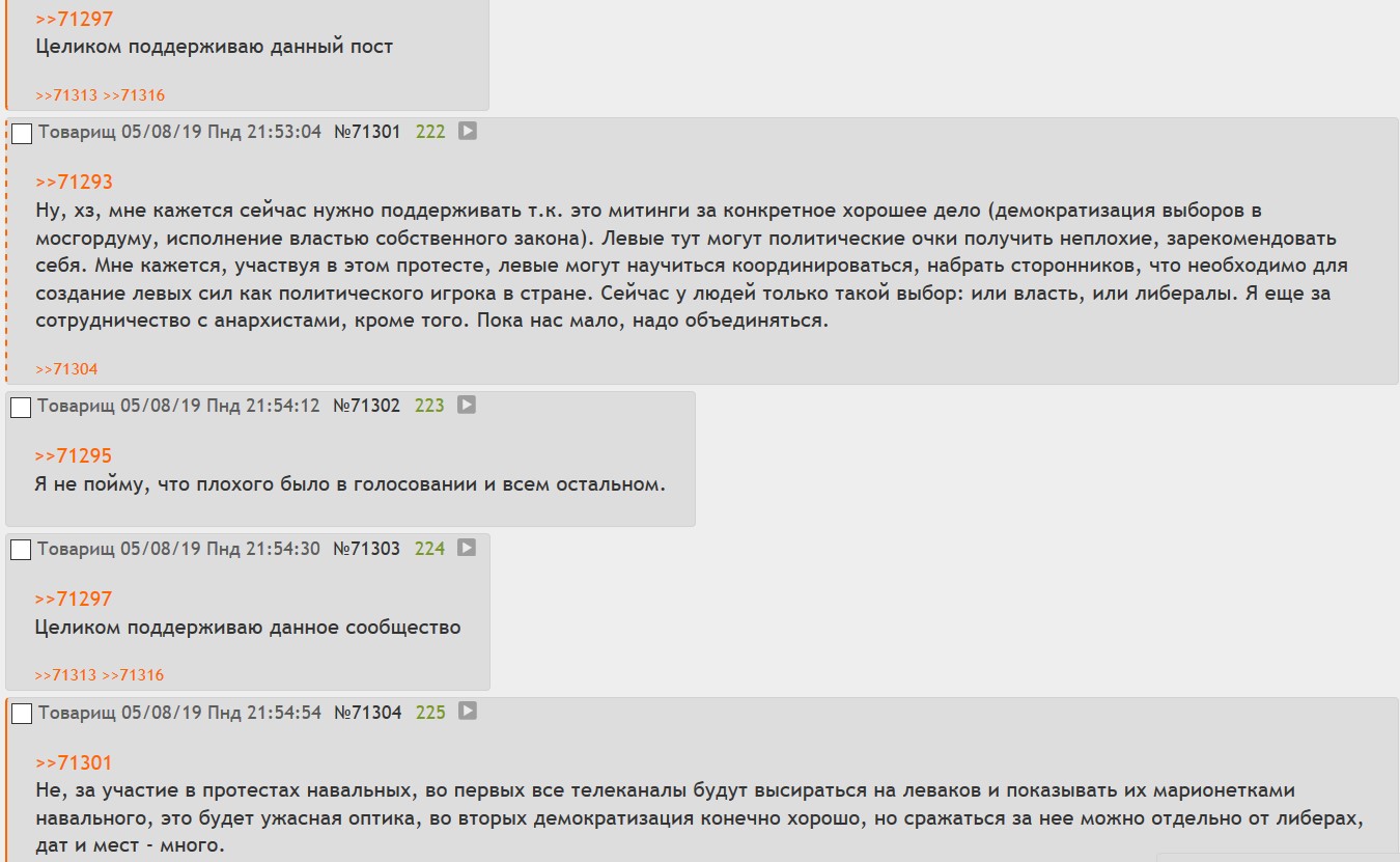 >>71293 Ну, хз, мне кажется сейчас нужно поддерживать т.к. это митинги за конкретное хорошее дело (демократизация выборов в мосгордуму, исполнение властью собственного закона). Левые тут могут политические очки получить неплохие, зарекомендовать себя. Мне кажется, участвуя в этом протесте, левые могут научиться координироваться, набрать сторонников, что необходимо для создание левых сил как политического игрока в стране. Сейчас у людей только такой выбор: или власть, или либералы. Я еще за сотрудничество с анархистами, кроме того. Пока нас мало, надо объединяться.