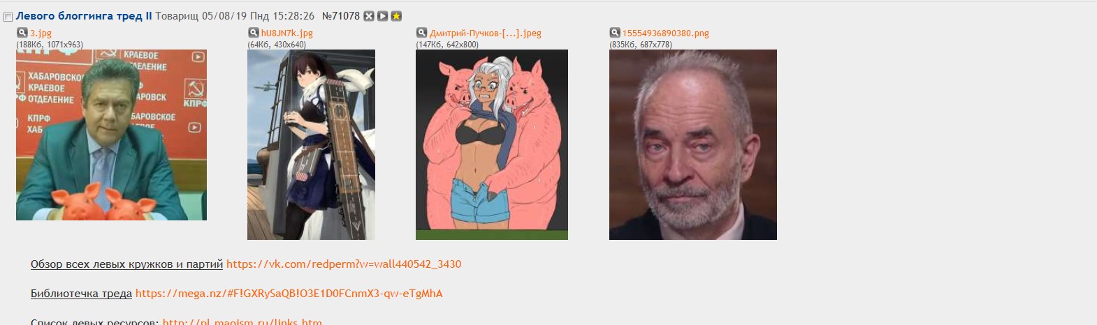 >>85358 >Одни балаболы, там работоспособных на рабочее дело - единицы. Под делом ты имеешь в виду агитацию рабочих? >одни анимешные мальчики-зайчики заики. Во-первых, что плохого в том, что я пощу аниме, во-вторых, ты не понял юмора. Если мы някаем и мимишничничаем на дваче, то необязательно мы ведём себя так же ирл. >Ну смогут они общаться с рабочими? У меня в кружке есть рабочий. Говорит, что на заводе все симпатизируют левым. Хотим попробовать распространить листовки среди них. Ты сам-то многого добился? >...по сути рассадники меньшевизма. Поясни. >Ну вот сделал я тред, ооох не нравится им Зюганов в шапке ради фана и типа "мы сидеть не будем" - детский сад достойный харкача на самом деле. А то, что треть постов в треде это "поссал на тупых блевачков" тебя не смущает?