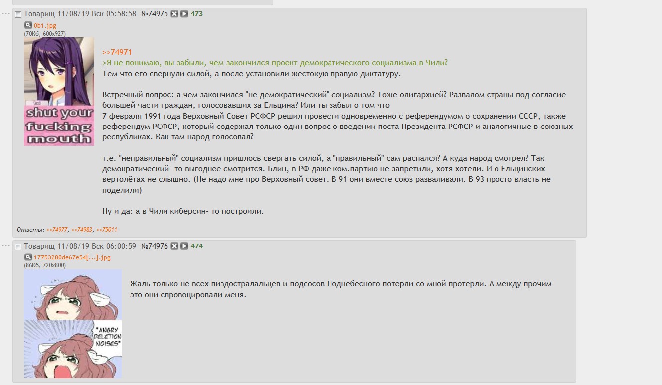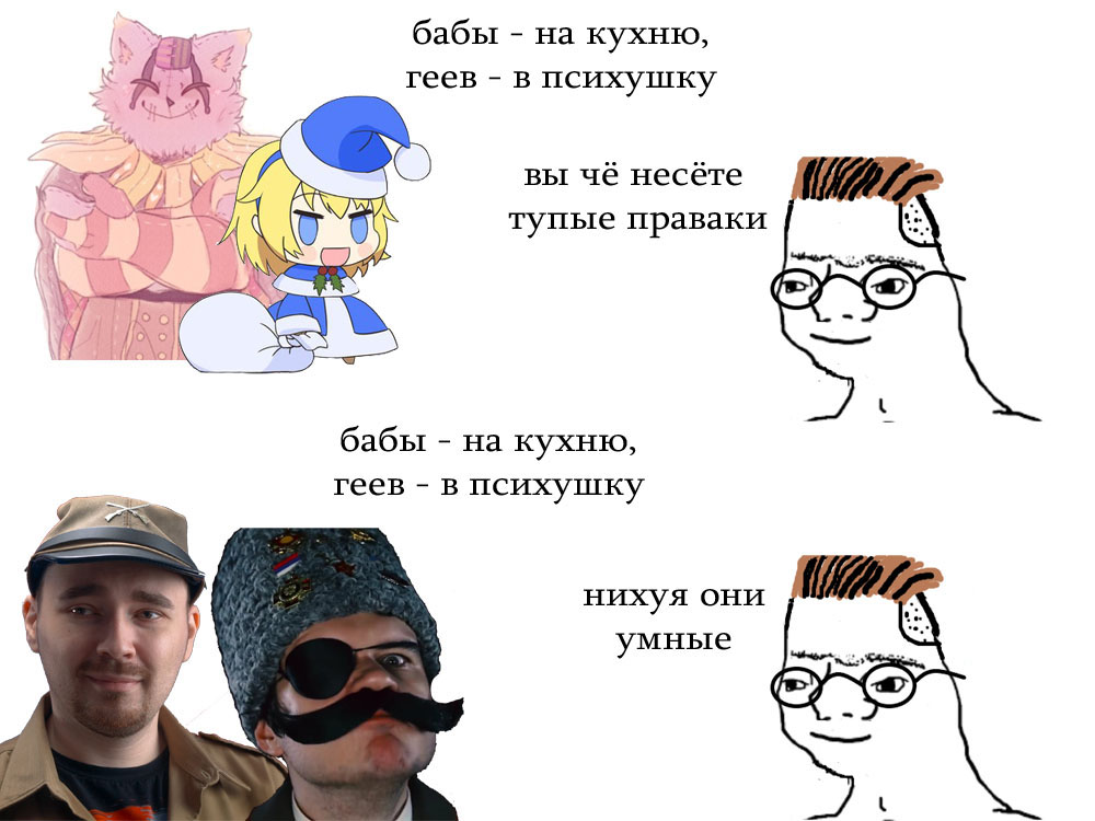 Пиздец,комми, вы уже совсем наголову ебанулись Сисяна защищать? >>75411 >Куда уж хуже. Окатыш, не бомби, водос очень даже хорош >>75412 >покажи, если есть. https://www.youtube.com/watch?v=eACtrfM6zN4 Ну бля, вот тебе оригинал >>75413 >"Должны поддерживать" - это уже СЖВ, мань Коммунизм про всеобщее братсво, если че. Уж как минимум не надо добавлять неравенства в этот мир и воевать со всеми подряд >>75414 >настоящий сталинист У тебя очень странное представление о сталинистах. Прямиком из агиток