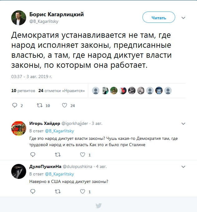 > Что такое демократия? Можно сказать, что это формальное разделение власти на несколько ветвей, многопартийность, ничем не ограниченные права человека – например, право снаркоманиться или сдохнуть от голода в сточной канаве. А можно сказать, что демократия – это единство народа и власти, когда народ полностью поддерживает власть и доверяет ей, а власть вкалывает день и ночь на благо народа и себя от него не отделяет. Кому что больше нравится. Но если говорить о демократии, то у нас при Сталине было именно второе.