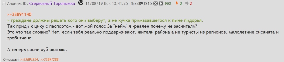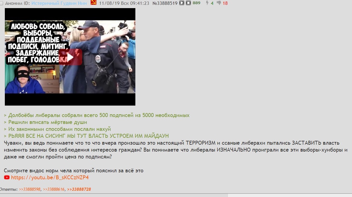 >>75074 А может ты просто либераха и тебе непреятно слышать эти факты? Давай вот просто порассуждаем. Даже в либеральном мышлении честные выборы это выборы без нарушения правил и законов. Это честная демократия в их понимании. Требования для регистрации кандидата на выборы это отсутствие судимостей+5к подписей. Однако сами либеральные активисты не смогли собрать 5к подписей для своих кандидатов. Поэтому начали вписывать мёртвых людей. За что справедливо и по закону были завёрнуты ЦИКом. После того как она были законно и справедливо завёрнуты они организовали митинги с привлечением звёзд шоу бизнесса для оказания давления на власть. Где я не прав, когда говорю что либерасты это ебаные террористы? Где я не прав, когда говорю что они НЕЗАКОННЫМИ методами давят на ЗАКОН, а?