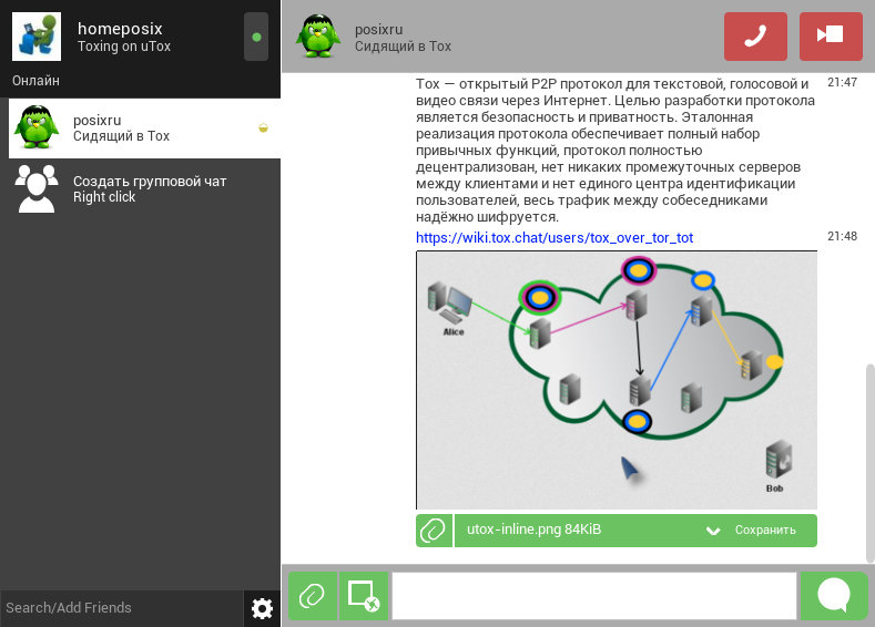 >>83273 >Руководство на русском где? >Взял бы перевёл бы пару статей или свою статьютнаписал бы с картинками и выложил бы >тут или в конфе в телеге или в группах вк с липового акк. >А так предложил и в кусты. Какое нахуй руководство? Загугли скрины того же uTox, качни его, потести, и никакое руководство там не надо. Всё предельно ясно. На крайняк - глянь сорцы, они открыты. >Как там что то делать? Как туда людей зазывать. Из настроек копируешь ToxID, и даёшь своему другу, он внутри TOX'a находит тебя по этому ToxID, добавляет, и общаетесь в токсе - децентрализированно.