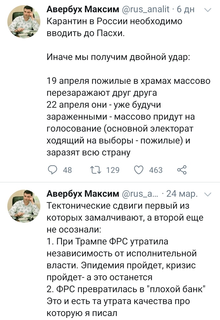 Путин сказал до 30 апреля выходные с сохранением заработной платы. Посмотрим, что ответит бизнес. Ожидаю максимальное обострение классовой борьбы. Теперь даже последний работяга поймет, что буржуй наемному работнику враг.