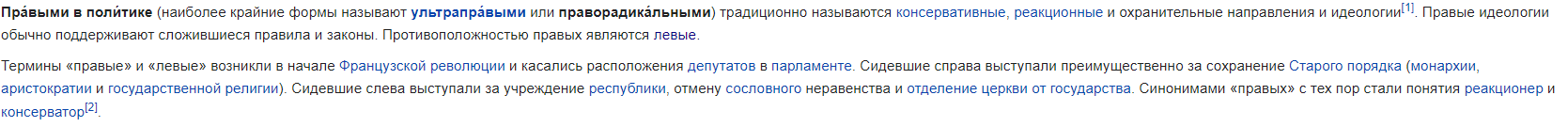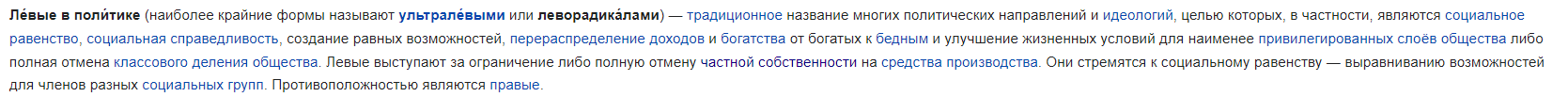 >>98844 >Надо ли говорить, что буржуазная политология для описания этих "левых" и "правых" прибегает к крайне абстрактным формулировкам без привязки к конкретным фактам, вот дескать "левые" они за равенство, а "правые" за иерархию Судя по только что тобой сказанному ты, дорогой, ничего в "буржуазной политологии" не смыслишь.