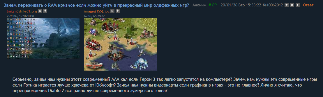 А ведь копролитыч сдохнет вместе со скуфами... Никто из зумерков и альфиксов не будет в этот мыльный лоуполи (или вообще ебучие спрайтики с гигантскими пикселями) кал катать/скачивать-хранить, кроме 2.5 поциентов уровня канала "СДЕЛАНО В СССР". Потихоньку сгинет в ближайшие 15-20 лет, как до этого вымер к хуям весь окаменевший игрокал 70-80-х. Скуфы сами про этот ретрокал слыхали поди только из ремейков и продолжения старых франшиз. Ну, может ещё будут, как щас делают с ретрокалом всякие атари, лопатами раздавать образы с соснолек залётным, которые потыкают в пару тайтлов, охуеют от копрокубического-спрайтового говняка и съебут дальше ебать гигабимбух верхом на радужном драконе в генеруемых ИИ слопосвитках.